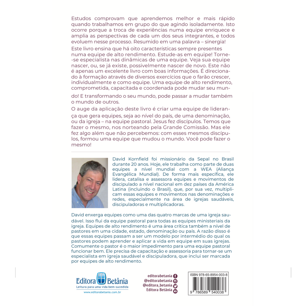 Este livro ensina que há oito características sempre presentes numa equipe de alto rendimento. Estude-as em equipe! Torne-se especialista nas dinâmicas de uma equipe. Veja sua equipe nascer, ou, se já existe, possivelmente nascer de novo. Este não é apenas um excelente livro com boas informações. É direcionado à formação através de diversos exercícios que o farão crescer, individualmente e como equipe. Uma equipe de alto rendimento, comprometida, capacitada e coordenada pode mudar seu mundo" E transformando o seu mundo, pode passar a mudar também o mundo de outros.