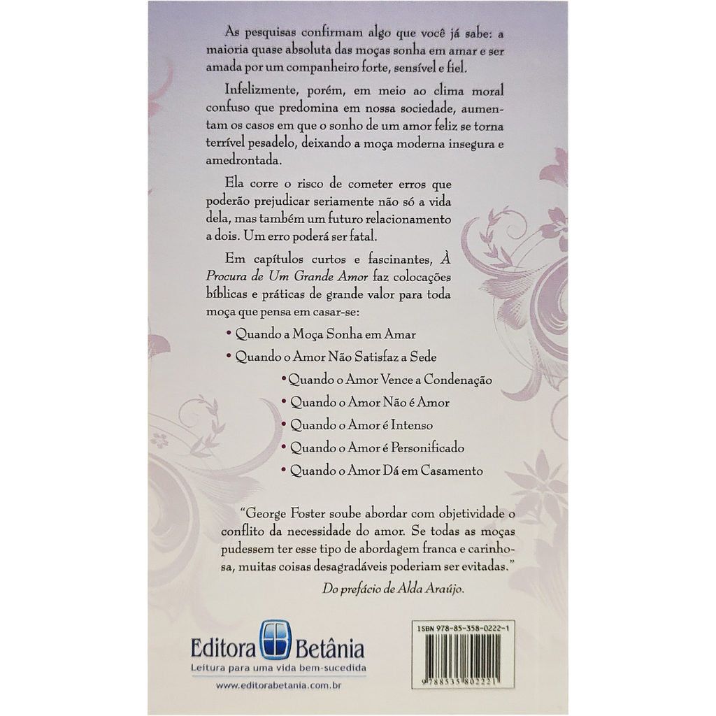 Em capítulos curtos e fascinantes, À Procura de um Grande Amor faz colocações bíblicas e práticas de grande valor para toda moça que pensa em casar-se.