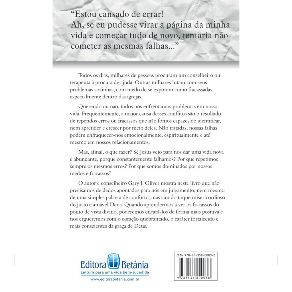 O autor e conselheiro Gary J. Oliver mostra neste livro que não precisamos de dedos apontados para nós em julgamento, nem mesmo de uma simples palavra de conforto, mas sim do toque misericordioso do justo e amável Deus. Quando aprendermos a ver os fracassos do ponto de vista divino, poderemos encará-lo de forma mais positiva e nos ergueremos com o coração quebrantado, o caráter fortalecido e mais conscientes da graça de Deus.