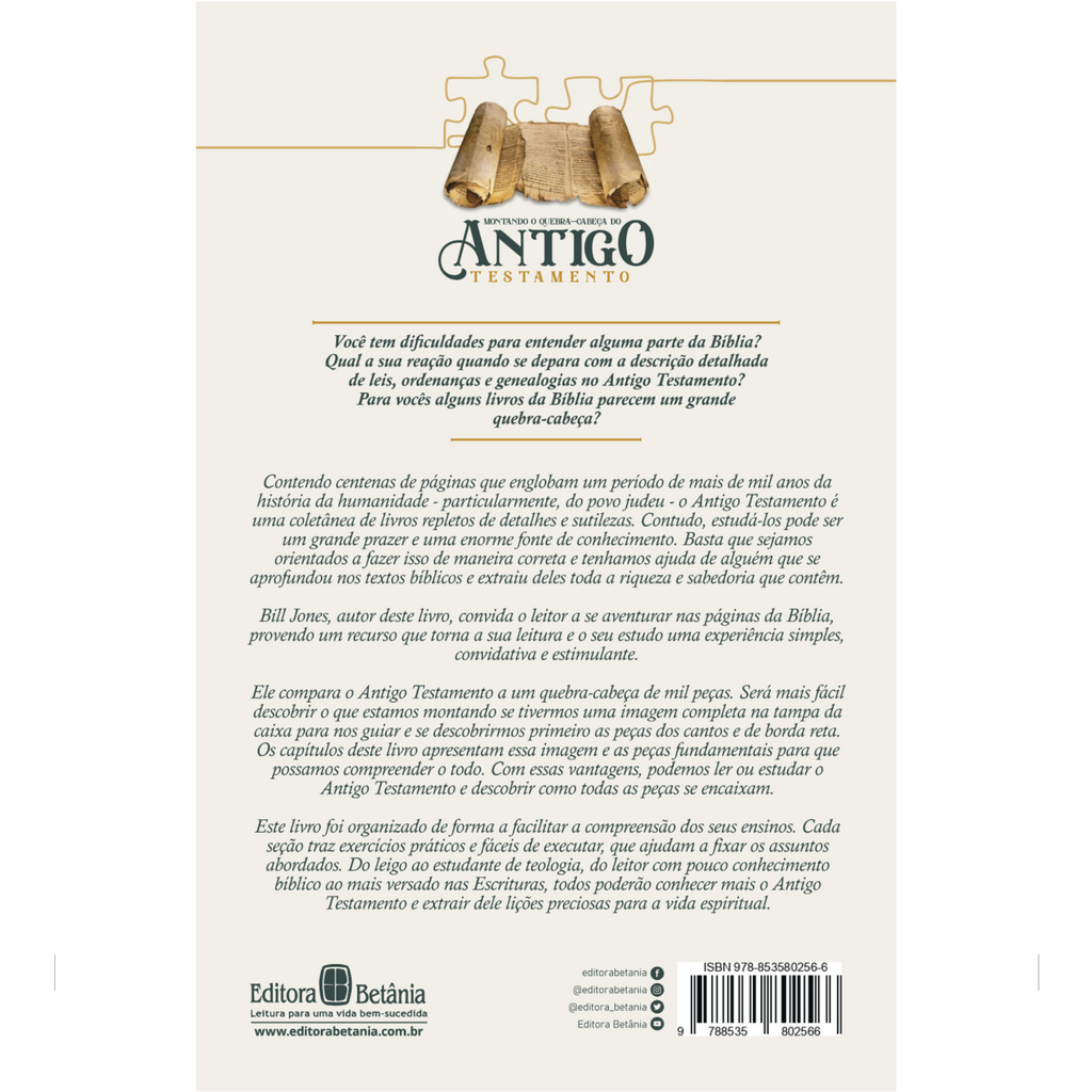 Ele compara o Antigo Testamento a um quebra-cabeça de mil peças. Será mais fácil descobrir o que estamos montando se tivermos uma imagem completa na tampa da caixa para nos guiar e se descobrirmos primeiro as peças dos cantos e de borda reta. Os capitulos deste livro apresentam essa imagem e as peças fundamentais para que possamos compreender o todo. Com essas vantagens, podemos ler ou estudar o Antigo Testamento e descobrir como todas as peças se encaixam.