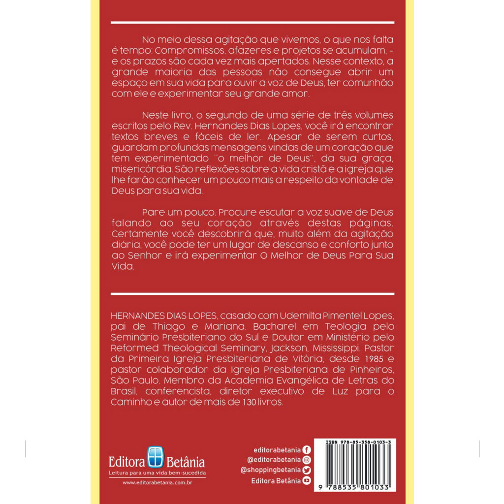 Pare um pouco. Procure escutar a voz de Deus falando ao seu coração através dessas páginas. Certamente descobrirá que, muito além da agitação diária, você pode ter um lugar de descanso e conforto junto ao Senhor e irá experimentar O Melhor de Deus Para Sua Vida.