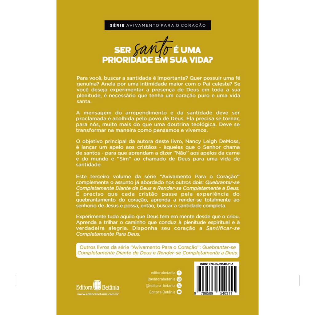 Este terceiro volume da série Avivamento Para o Coração completa o assunto já abordado nos outros dois: "Quebrantar-se Completamente Diante de Deus" e "Render-se Completamente a Deus". É preciso que cada cristão passe pela experiência do quebrantamento do coração, aprenda a render-se totalmente ao senhorio de Jesus e possa, então, buscar a santidade completa.